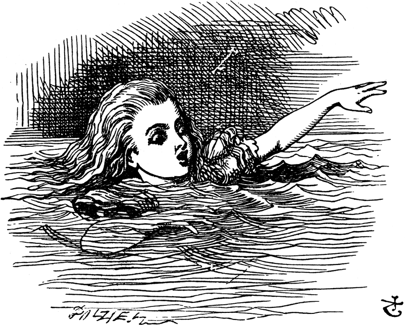 As she said these words her foot slipped, and in another moment, splash! she was up to her chin in salt water. Her first idea was that she had somehow fallen into the sea, ‘and in that case I can go back by railway,’ she said to herself. (Alice had been to the seaside once in her life, and had come to the general conclusion, that wherever you go to on the English coast you find a number of bathing machines in the sea, some children digging in the sand with wooden spades, then a row of lodging houses, and behind them a railway station.) However, she soon made out that she was in the pool of tears which she had wept when she was nine feet high.