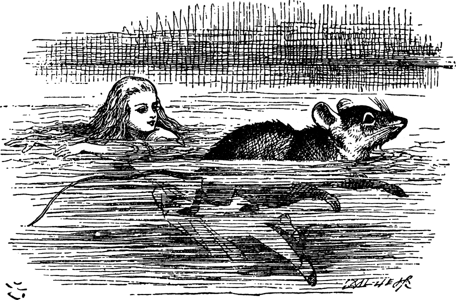 ‘Would it be of any use, now,’ thought Alice, ‘to speak to this mouse? Everything is so out-of-the-way down here, that I should think very likely it can talk: at any rate, there’s no harm in trying.’ So she began: ‘O Mouse, do you know the way out of this pool? I am very tired of swimming about here, O Mouse!’ (Alice thought this must be the right way of speaking to a mouse: she had never done such a thing before, but she remembered having seen in her brother’s Latin Grammar, ‘A mouse – of a mouse – to a mouse – a mouse – O mouse!’ The Mouse looked at her rather inquisitively, and seemed to her to wink with one of its little eyes, but it said nothing.