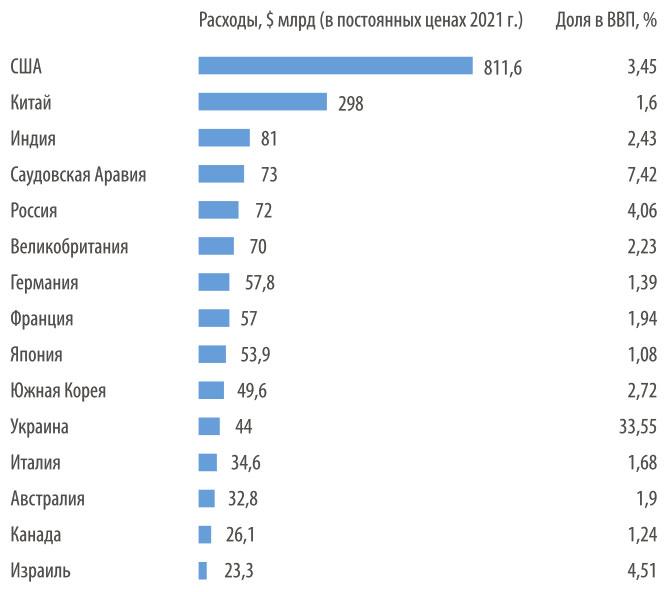 В пятерку лидеров по расходам вошли США, Китай, Индия, Саудовская Аравия и Россия — в сумме их траты составили 63% от общемировых [13].