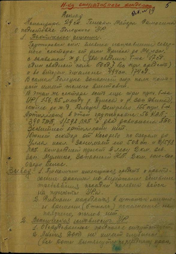 Из доклада командира 27 ск о подготовке Полоцкого УР.
