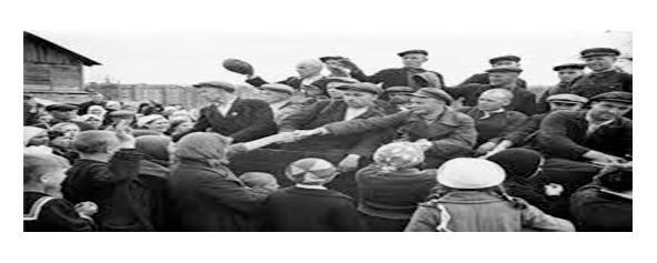 — На пра-во! Равняйсь! Смирно! Товарищи, жадные до крови гитлеровские собаки уже долгое время ведут войну с беззащитными женщинами и детьми. Наш враг кровожаден и жесток. Он напал на нас вероломно, без объявления войны. Наши братья с оружием в руках, неся потери, оказывают упорное сопротивление. Им нужно помочь. Поэтому вас и мобилизовали. Сейчас я буду называть ваши фамилии. Кого назову должен ответить: «Я», выйти из строя и встать рядом со мной в затылок друг другу по пять человек. Вопросы есть? Послышалось недружное: «Нет вопросов, понятно всё, ага, чаго уж там…»