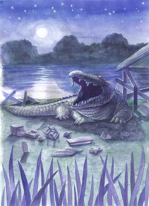 Вдруг Бамбангу стало трудно плыть. Болотный вкус воды переменился и напоминал кровь и гнилые объедки. Да и сама вода загустела, будто кисель. Крокодил отчаянно грёб лапами, молотил хвостом, чувствуя как тонет. На дне он обнаружил огромного осьминога. Оторопев, Бамбанг заглянул ему в глаза и увидел в них звёздное небо и Млечный путь.