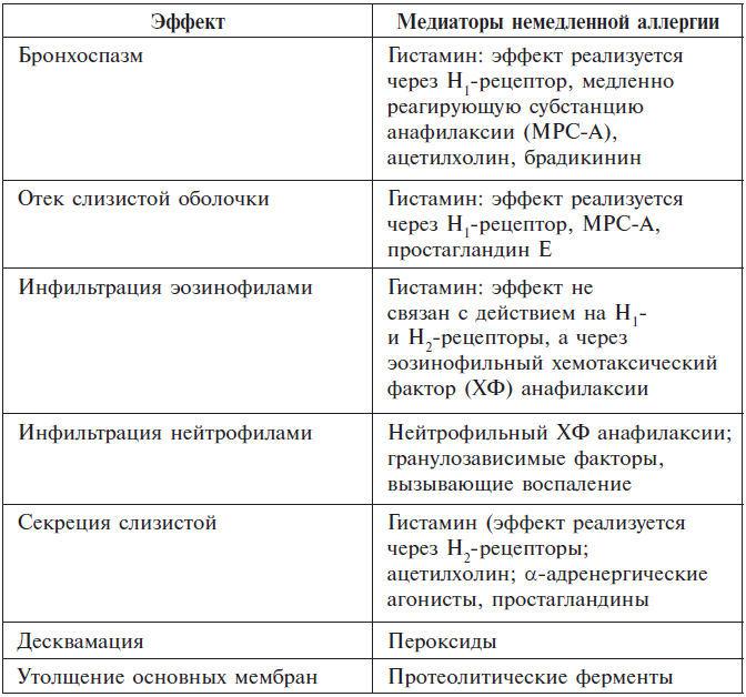 Медиаторы, например гистамин, повышают проницаемость сосудов и приток жидкости. Лейкотриены и простагландины вызывают воспалительный процесс. В процесс вовлекаются базофилы и другие иммунокомпетентные клетки. Клиническими проявлениями такой реакции являются зуд, чиханье.