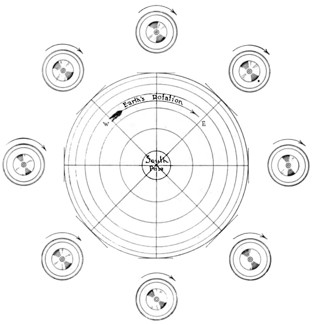 Suppose you were to place such a small wheel supported by its axis upon a larger wheel which also is revolving. The rotation of the larger wheel would so influence the smaller wheel that its axis would point in the same direction as the axis of the larger wheel. Why this is the case does not concern us here. Let it suffice that the larger wheel will cause the smaller wheel to behave in this manner. This is in accordance with a natural law. This law operates as unfailingly as the law which causes an unsupported body to fall to the ground.