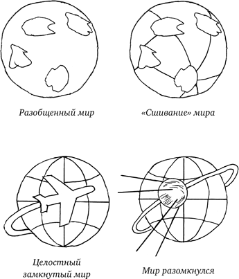— Тут есть разница. Прежде мир был разобщен: Средиземноморье, Европа, Восточная и Центральная Азия, Иберийская Америка и т.д. То, о чем ты говоришь, объединило этот мир. Путешествия, великие географические открытия, военные походы, развитие торговых путей, дальние дипломатические миссии вели к «сшиванию» мира в некое единство (Великий шелковый путь, Марко Поло, походы Чингисхана и Александра Македонского, Колумб и т.д.). Авиация, а затем системы коммуникации и связи довершили дело: мир стал не только целостным, но и замкнутым. Выход же человека в космос разомкнул пространство.