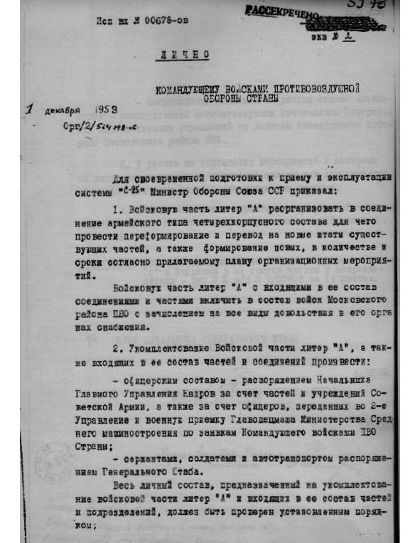Для эксплуатации системы С-25 в Московском Округе ПВО, основанная в 1953 году образовательная и техническая часть №2 была переименована в Первую Отдельную Армию Особого Назначения Войск ПВО страны под командованием генерал-полковника К. Казакова.