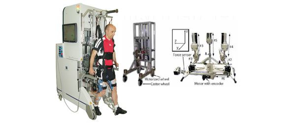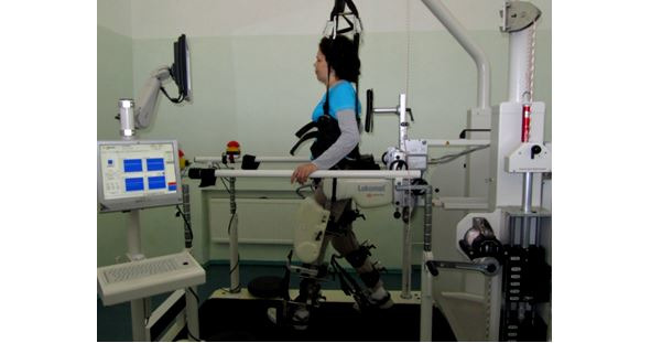 Идея роботизированного комплекса, позволяющего восстанавливать функцию движения у пациентов с повреждениями центральной нервной системы и, как следствие, глубоким неврологическим дефицитом, была реализована Джери Коломбо в роботизированном аппарате «Lokomat» (рис. 14). В настоящее время такие роботизированные системы используют для детей с детским церебральным параличем (ДЦП), пациентов с последствиями острого нарушения мозгового кровообращения (ОНМК), спинального инсульта и иными неврологическими патологиями, при которых присутствует паралич нижних конечностей. Джери Коломбо решил оптимизировать и ускорить восстановительный процесс больных с параличом при помощи специализированного манипулятора, подстраиваемого персонально под больного, управляемого компьютером. Такая идея никому не понравилась. Инженеру с трудом удалось найти денежные средства на исследования. Однако в 1996 г. была основана компания «Hocoma». А в 2001 г. был выпущен первый «Lokomat». В 2005 г. — первый робот для осуществления детской реабилитации. Робот состоит из беговой дорожки, системы роботизированных ортезов, подвесного механизма, предназначенного для снижения массы больного до требуемых значений. При весе в сто килограммов, больной может передвигаться, как будто он весит, к примеру, двадцать килограммов. Благодаря этому можно существенным образом снизить утомляемость и формировать правильный двигательный стереотип. Ортезы, на которых присутствуют двигатели, надевают на нижние конечности, при этом тазобедренные, коленные суставы сохраняют возможность производить движения в пределах физиологических двигательных актов. Углы сгибания-разгибания, скорость передвижения, мощность функционирования поддаются регулировке. В системе присутствуют четыре двигателя. Их возможно независимо друг от друга настраивать (углы сгибания, мощность). Из-за возможности регулировать сгибание-разгибание систему могут использовать больные, имеющие мышечные либо ортопедические контрактуры. Благодаря снижению мощности двигателя увеличивается двигательная нагрузка. Датчики считывают расположение конечностей. Данные поступают к центральному процессору, который управляет ходьбой, анализирует поступающую информацию. После обработки информация выводится на экран монитора (представляются специализированные индикаторы либо графики ходьбы). Занимающийся может сам произвести оценку своей активности, выполнить корректировку, если требуется — на этом построен принцип БОС.