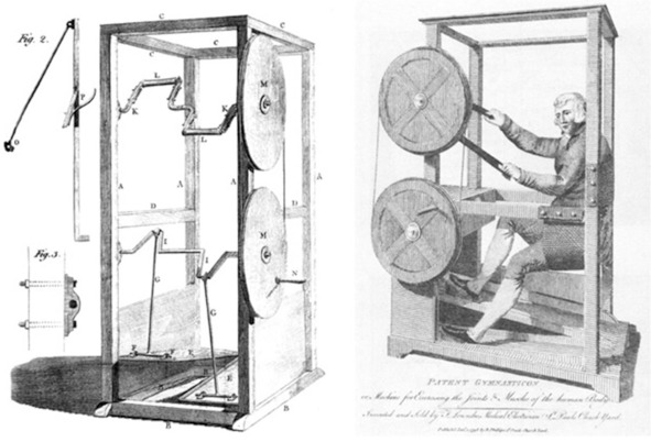 Используя труды Николя Андри в Френсис Лаундс (Francis Lowndes) изобрел первый спортивный тренажер — «гимнастикон» (рис. 4). Прототип современного велотренажера позволял приводить маховики в движение при помощи рук. Его рекомендовали для лечения подагры, частичного паралича, ревматизма и слабости. После изобретения «Gymnasticon» специалистами была разработана целая система физических тренировок при помощи силовой техники. А еще через пару лет тренажеры можно было приобрести более чем в 140 странах, однако они достаточно дорого стоили.