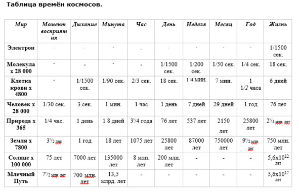 Если мы обратимся теперь к нашей таблице времен, мы увидим, что одна цифра также появляется в ней несколько раз. Не только время клетки крови в 28 000 раз дольше времени составляющих ее молекул, но и время мира Природы в 28 000 раз дольше времени человека, и кроме того, время Млечного Пути в 28 000 Х 28 000 раз дольше времени Земли. Из этого следует много интересных соответствий. День молекулы должен быть равен дыханию клетки крови. День человека должен быть равен дыханию Природы. Жизнь Земли должна быть равна дыханию галактики. И отношение друг к другу всех других временных делений этих космосов будет таким же. Даже там, где эта ключевая цифра 28 000 не появляется, мы начинаем видеть, что временной коэффициент между космосами может представлять отношение между другими отрезками их времен. Мы видим, что год Природы равен дню Земли. Точно так же год Земли кажется почти точно равным часу Солнца. Кроме того, месяц Земли — это секунда Солнца, день Солнца — секунда Млечного Пути, и так далее. Не только дыхание, день, жизнь, но также «секунда», «минута», «час», «неделя», «месяц», видимо, на самом деле являются космическими делениями времени, связывающими единицы опыта на одном уровне с единицами опыта на многих других уровнях.