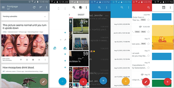Рис. 1.1. Независимо от того, какое приложение Google вы используете, компонент плавающей кнопки действия (FAB) всегда обеспечивает легкий доступ к основному действию экрана в правом нижнем углу