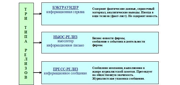 На тот случай, если журналистика когда-нибудь станет академической наукой, к чему она особенно стремилась у нас в советские времена, следует учредить простенькую двухуровневую классификацию, в которой пресс-релиз вступает в родовидовые отношения с другими типами сообщений для прессы. Для простоты все их назовем релизами — это слово тоже употребляется в профессиональной среде.