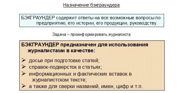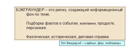 Background — фон, задний план, задник. Backgrounder, соответственно, — информационное сообщение, содержащее фоновую, сопутствующую фактуру, досье. Это информационная справка о компании или организации, которая содержит краткие, но достаточно полные сведения о компании или организации, и может быть использована журналистами при подготовке материала. Собственно, в этом и назначение бэкграундера — дать основную справочную информацию. Естественно, эта информация должна не только сочетать полноту и краткость, но и быть интересной.