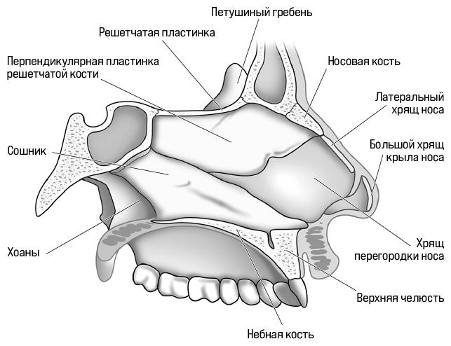 Перегородка носа отделяет одну его половину от другой (это нужно для регуляции потока воздуха через нос) и служит своеобразной опорой всей конструкции. Знаменитый «провалившийся нос» на последних стадиях некоторых деликатных болезней — следствие разрушения перегородки.