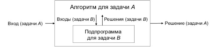 Рис. 19.1. Если задача А сводится к задаче В, то задача А может быть решена с помощью полиномиального (по входному размеру) числа вызовов подпрограммы для В и полиномиального объема дополнительной работы