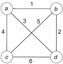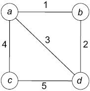 минимальное остовное дерево включает ребра (a; b), (b; d) и (a; c) при совокупной стоимости 7.