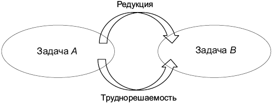 Рис. 19.3. Распространение труднорешаемости в от А к B: если задача А сводится к задаче B и А — труднорешаемая задача, то и B — тоже труднорешаемая