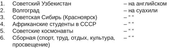 Тексты, которые были у нас в ИВЯ под рукой на I—III курсах, это, в основном, сказки, рассказы об обычаях и традициях племен и народностей в Восточной Африке, пословицы и поговорки, некоторые произведения танганьикского писателя Шаабана Роберта, и т. п.