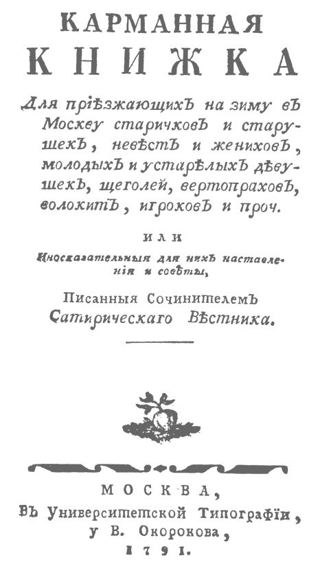 автордың кітабын онлайн тегін оқу Карманная книжка для приезжающих на зиму в Москву старичков и старушек, невест и женихов, молодых и устарелых девушек, щеголей, вертопрахов, волокит, игроков и проч., или Иносказательные для них наставления и советы, писанные сочинителем Сатирического