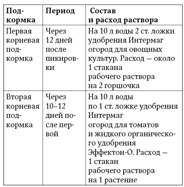 После пикировки рассады в горшочки в течение 3-х дней поддерживают температуру 20–22 оС днем и 16–18 оС ночью. Как только рассада приживется, температуру снижают днем до 18–20 оС, ночью до 15–16 оС. Поливают рассаду в горшочках 1 раз в неделю до полного промокания почвы. К очередному поливу почва должна немного подсохнуть, но в то же время необходимо следить, чтобы не было длительных перерывов в поливах. В ограниченном объеме грунта распикированная рассада нуждается в регулярных подкормках (табл. 2). При этом важно не допускать попадания раствора на листья.