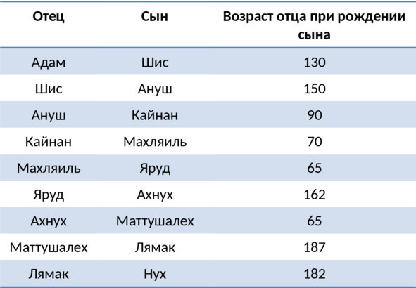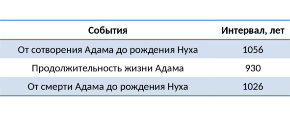 Далее мы приведем содержащуюся в Торе информацию по временным отрезкам, касающимся сотворения и смерти пророка Адама (мир ему), а также рождения пророка Нуха (мир ему). При этом следует помнить, что разные (еврейские, сирийские и греческие) издания Торы во многом противоречат друг другу. Подробнее об этом можно узнать из книги «Представление истины» шейха Рахматуллы Хинди (на арабском и урду). Тем не менее далее приводятся таблицы, составленные на основе данных из Торы.