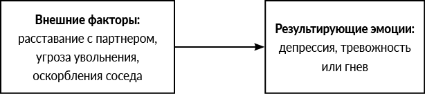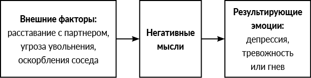 Обычно людям кажется, что внешние факторы — события, происходящие с ними, — определяют их жизнь, порождая эмоции: злость или удовлетворение, радость или печаль. Следуя этой логике, следовало бы признать существование прямой связи между событием и эмоцией. Например, если жена уйдет от меня, мне станет грустно. Если кто-то оскорбит меня, я почувствую обиду. В человеческом представлении существует причинно-следственная связь между событиями и эмоциями, которую можно представить в виде следующей схемы: