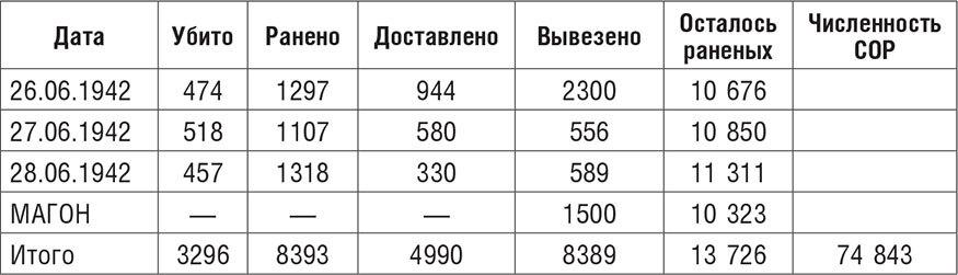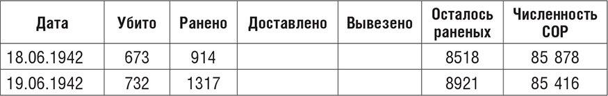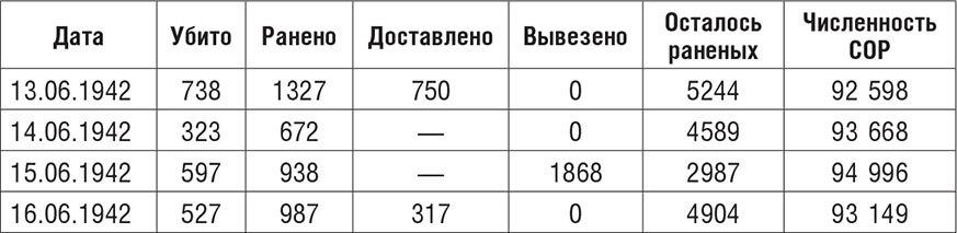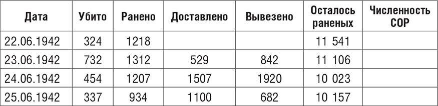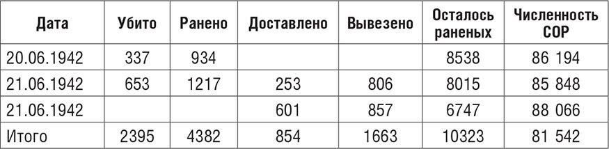 С начала штурма до 28 июня 1942 года (дата, до которой еще велся учет потерь) убитыми защитники потеряли 12 тыс. человек, ранеными – около 25 тыс. Данные сводок никак не стыкуются с официальными цифрами по Приморской армии в послевоенном статистическом сборнике: 5049 человек убитыми и 20 112 ранеными. Причин две: это цифры по армии (без флотских частей), и вторая причина – цифры все же занижены, так как в сборнике приводятся данные только по тем бойцам, гибель которых подтверждена. Но цифра численности СОР становится все более условной. Она не учитывает потери пленными.