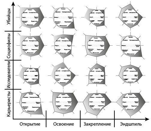 Рис. 14. Сравнение: как игроки каждого из типов мотивируются на разных этапах приобретения опыта.