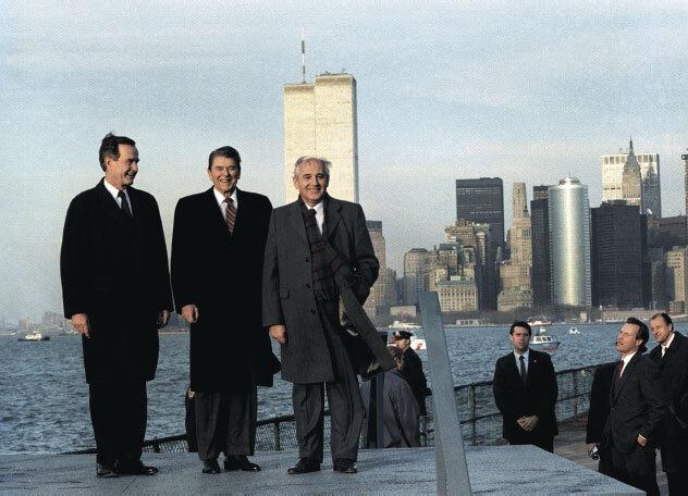 На фото: Джордж Буш, Рональд Рейган, Михаил Горбачев. 1988 г.