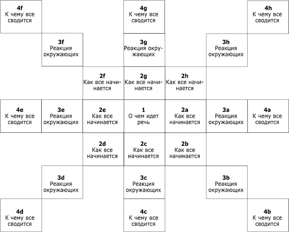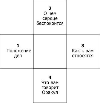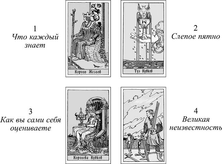 Этот расклад служит для самопознания. Он имеет психологический подтекст и напоминает знаменитую схему Йохари-Фенстера1, показывающую четыре аспекта личности. Карты раскладываются следующим образом2.