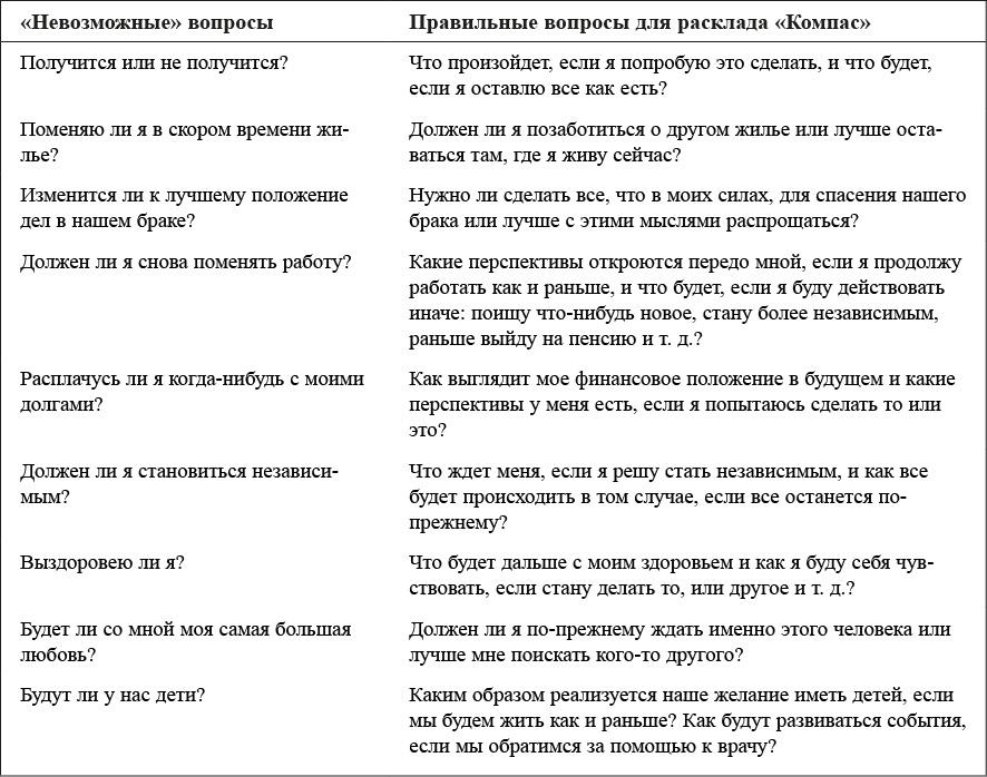 Разумеется, существуют вопросы, на которые Таро не в состоянии ответить. Вы никогда и ничего не узнаете об именах, телефонных номерах и не сможете получить другую конкретную информацию. Вы также не найдете ответа на вопрос о том, когда случится то или иное событие. Если возможен ответ только «да» или «нет», то подобный вопрос следует переформулировать. Только в этом случае вы можете надеяться на то, что получите совет от Таро с помощью расклада «Компас». Вот несколько примеров.