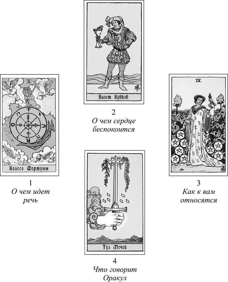 Если вы спрашиваете о любви и взаимоотношениях, тогда вам более всего подходит расклад «Оракул любви». С его помощью вы можете выяснить, как к вам относится интересующий вас человек или на что вас вдохновляет Оракул, то есть какой он вам дает совет. Типичный вопрос, который задают этому раскладу, таков: «Каковы мои взаимоотношения с этим человеком?» Давайте рассмотрим следующий пример. Из него можно сделать следующий вывод: