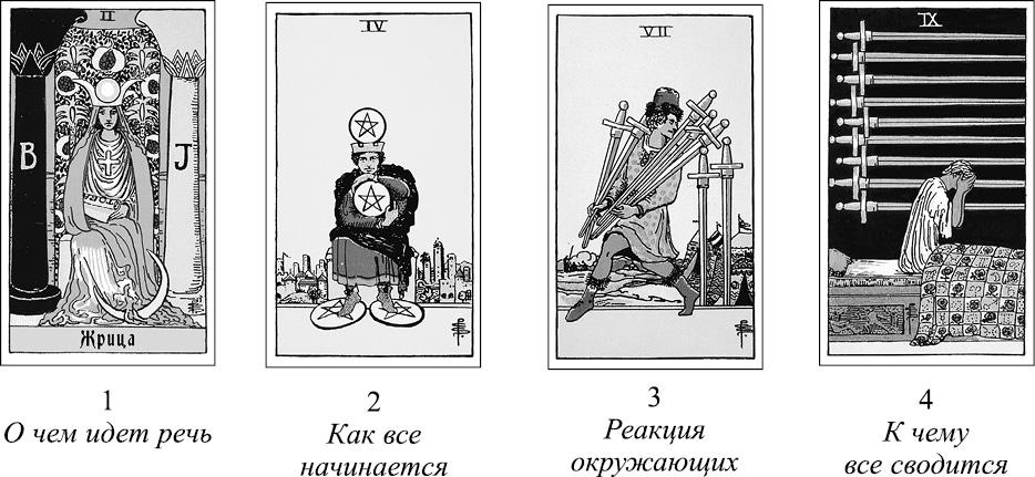 Толкования карт находятся в соответствующей части данной книги. Если коротко, то расклад говорит о каком-то хорошем предзнаменовании (Жрица), но вы чрезмерно осторожны, а может быть, и жадны (Четверка Пентаклей). Затем вы столкнетесь с людьми, которые обхитрят вас (Семерка Мечей), и, наконец, вас ждут бессонные ночи, и вы раскаетесь, что пошли этой дорогой (Девятка Мечей).