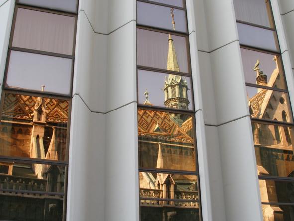 Зеркальный фасад отеля Hilton. Для любителей фотографии идеальная возможность осмотреть все труднодоступные места церкви Матьяша, затененные близким расположением здания гостиницы.