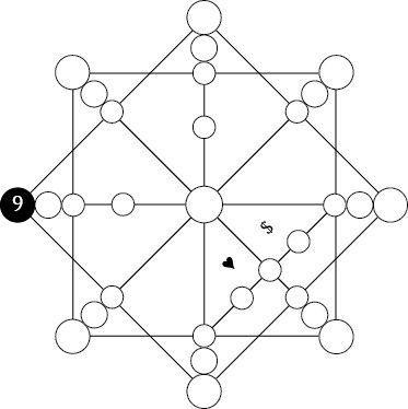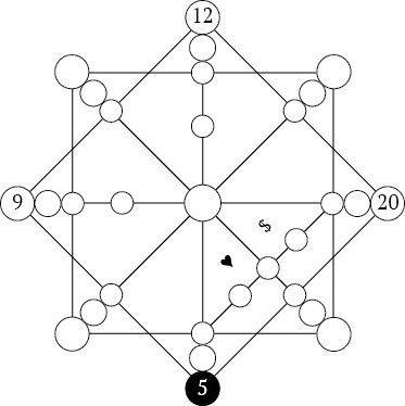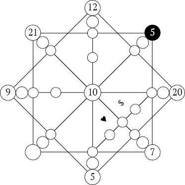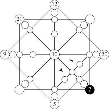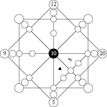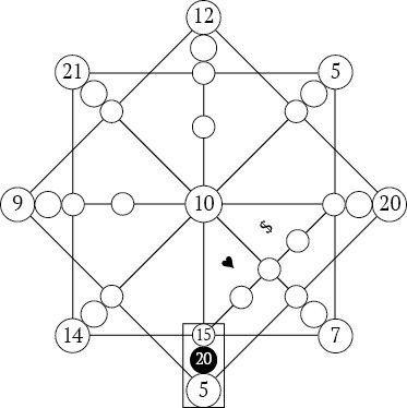 Кроме того, существует точка 3 (рис. 19), которая является входом в денежный канал. Она расположена на диагонали благополучия и указывает на то, как мы зарабатывали деньги в прошлом, а также на ошибки, которые совершали в отношении финансов. Формула этой точки: 20 + 10 = 30 = 3 + 0 = 3.