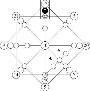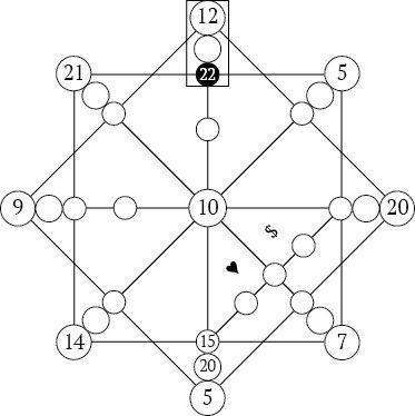 Талант самовыражения – это точка 22 (рис. 17). Находим ее путем сложения верхнего угла диагонального квадрата 12 и центра Матрицы 10.