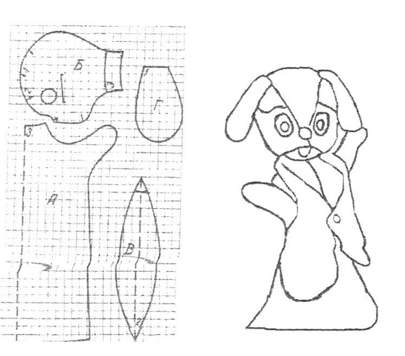 Перчаточных кукол, изображающих зверей, лучше всего изготовлять из кусочков меха, набивая головы поролоном. Так они будут симпатичнее смотреться. Но можно сшить и из других обрезков ткани, которые окажутся под рукой. Главное, проявить собственную фантазию. Конечно, чтобы стать настоящим мастером кукольником, надо много учиться. Но ведь всякая учёба начинается с малого. Я знаю, что даже студенты кукловодческих факультетов театральных институтов, т.е. будущие актёры-кукольники, на первых своих занятиях учатся мастерить перчаточных кукол. Значит, дело это не такое простое… Но и не такое сложное. Научились же герои нашей сказки, да и мы заодно. Я училась шить таких кукол по выкройкам в старых журналах — вроде этой. Выкройки удобнее чертить на специальной миллиметровой бумаге. Тогда одна клетка будет в точности соответствовать 1 куб. см.