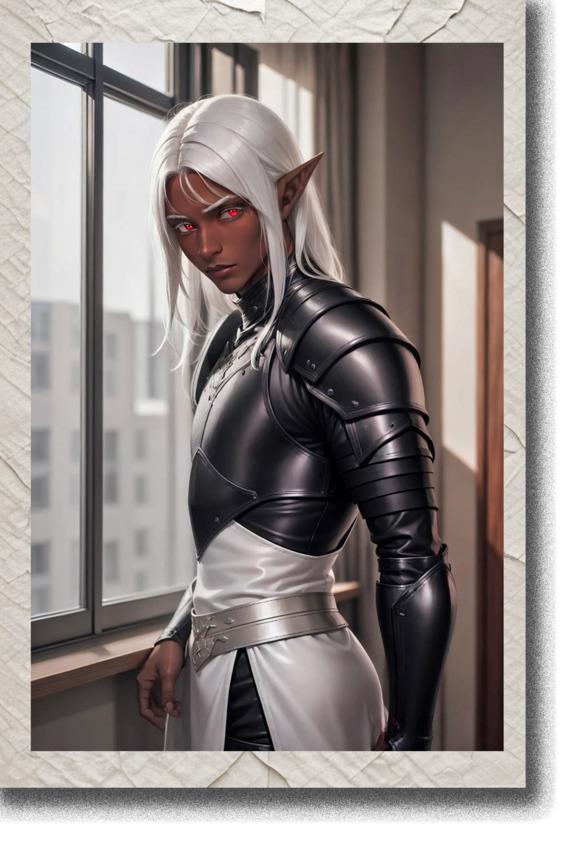 Лаэлитар открыл дверь, и все четверо вошли в кабинет с небольшим окном, обставленный грубоватой мебелью. Эльф застыл на пороге, и было от чего. У окна стоял, поправляя кожаный наруч, эльф с белоснежными волосами, угольно-черной кожей и алым взглядом. Выглядел он ненамного старше практикантов, хотя в эльфийской расе сложно было судить о возрасте.