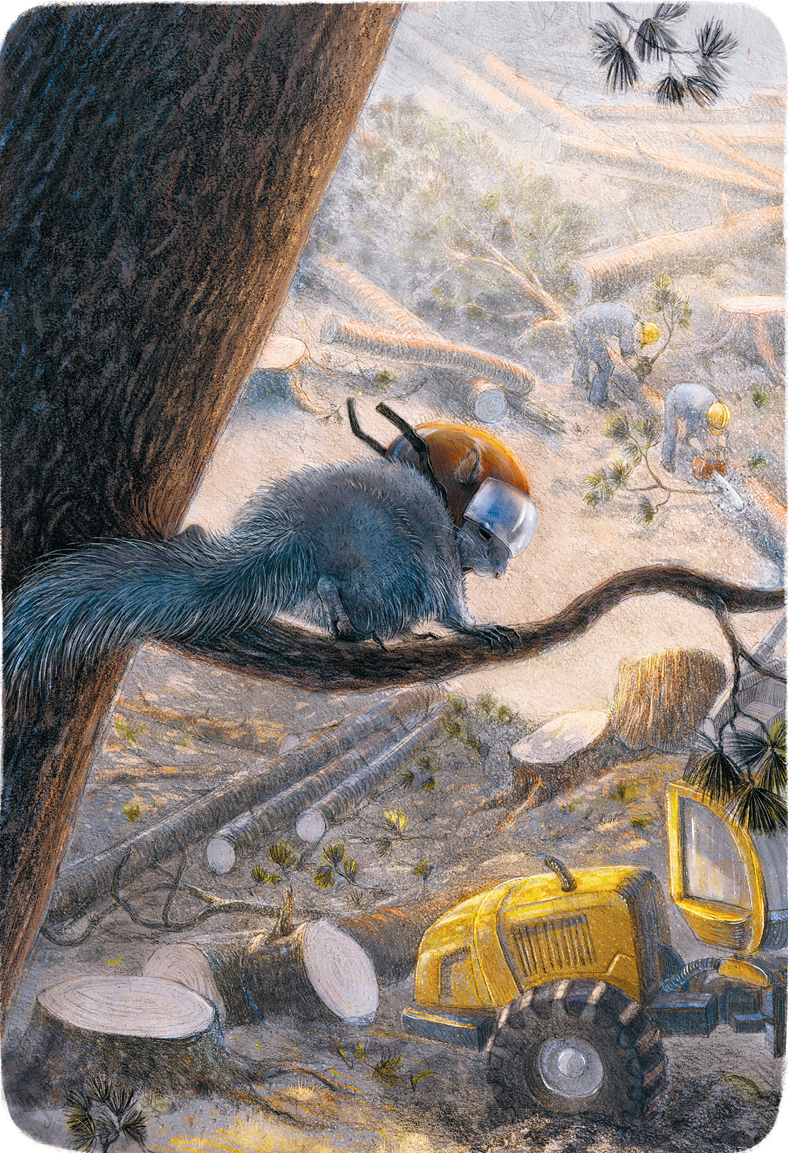 Привычный лес теперь выглядел совсем по-другому. Спиленные сосны безжизненно лежали на земле. Такуми грыз орехи и наблюдал за происходящим вокруг. Над головой летала и пронзительно чирикала птичка белоглазка: «Какой ужас! У нас больше нет дома! Что же делать?!» Мимо трактора медленно протопал ворчащий ёж: «Всё пропало! Конец!»