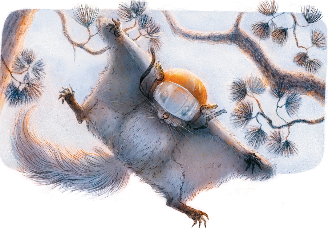 Внезапно ветки вокруг Такуми задрожали. Лесорубы завизжали пилами прямо под его домом. Когда дерево начало падать, бельчонок с лёгкостью выпрыгнул из дупла, успев схватить пару орехов. Такуми был белкой-летягой, поэтому расправил лапки и ловко спланировал на крышу трактора.