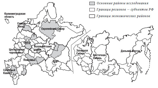 Таким образом, задача, которую мы перед собой поставили, потребовала специальных методов исследования. Эти методы состояли в соединении анализа материалов статистики с подробными обследованиями ряда конкретных территорий. Главное в наших методах исследования – полимасштабность. Для решения разных задач использовались и разные масштабы. Начиная с обзора страны в целом, мы спускались до совершенно конкретной завалинки. Или шли обратным путем, снизу вверх: от домохозяйств к отдельным поселениям, далее – к административным районам и регионам России. Мелкий, обзорный масштаб требует работы со статистикой и литературой, хотя не исключает и использования личных впечатлений. Средний – это опора на статистику в сочетании с собственными обследованиями регионов.