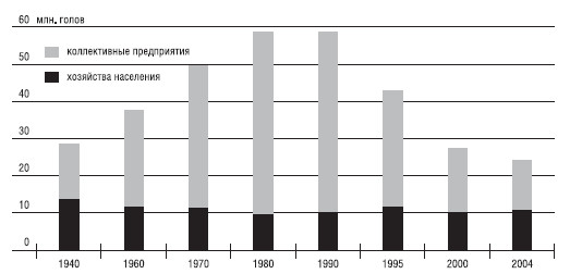 Рисунок 1.3.1. Поголовье крупного рогатого скота в коллективных предприятиях и в хозяйствах населения, 1940–2004, млн. голов