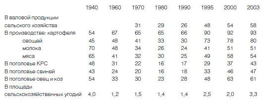 Таблица 1.3.1. Доля хозяйств населения в производстве сельскохозяйственной продукции, 1940–2003, %