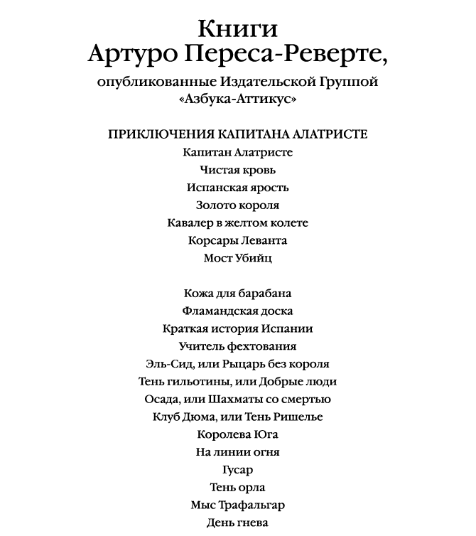 Гусар ; Тень орла ; Мыс Трафальгар ; День гнева : романы / Артуро Перес-Реверте ; пер. с исп. А. Богдановского, Н. Кирилловой, Е. Матерновской. — СПб. : Азбука, Азбука-Аттикус, 2022. — (The Big Book. Исторический роман).
