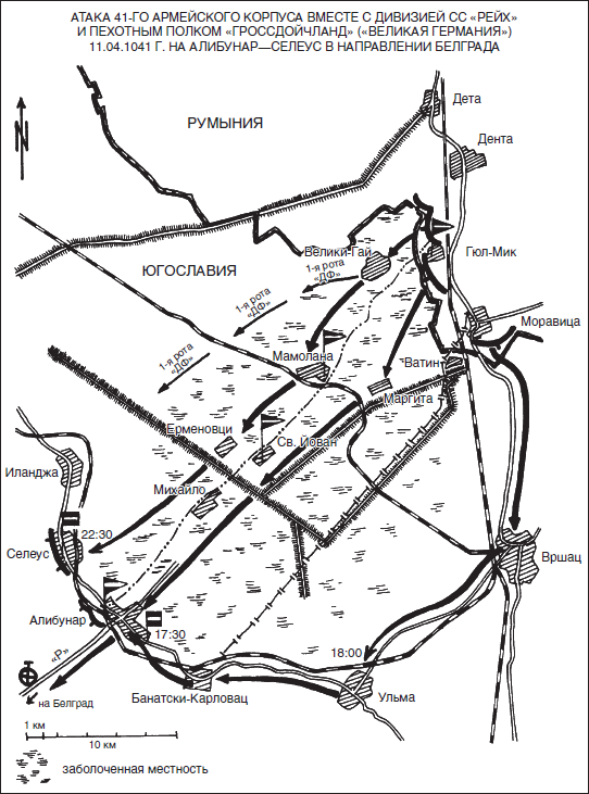 6 апреля 1941 года дивизия «Дас Рейх» тоже получила неожиданный приказ без предварительной подготовки и без достаточного обеспечения горючим выступить ускоренным маршем из района Везуля в Южной Франции. Дивизия отправилась в путь через Вогезы с их обледеневшими перевалами и заснеженный Шварцвальд и далее по маршруту Мюнхен – Зальцбург – Линц – Вена – Будапешт – Аради (Орадя) в Тимишоару (в прошлом Темешвар, Темешбург), экономический и культурный центр банатских швабов (швабы переселились сюда после 1716 г., когда Темешвар (упоминается как венгерский город с 1212 г.) был присоединен к Австрии (в 1552–1716 гг. был под властью турок); с 1920 г. в составе Румынии. – Ред.).