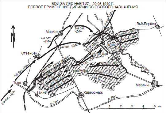 28.05.1940 года. В Буа-д’Аваль: прицельный огонь вражеской артиллерии. Унтерштурмфюрер СС Хайнц Вернер (позднее командир 10-й роты «ДФ» и командир 3-го батальона «ДФ»), сейчас командир 1-го взвода, легко ранен, остается со своим взводом. Достигнув населенного пункта Сек-Буа, мы окапываемся. Штурмовая группа Кёрбиссера выходит вперед на разведку, возвращается с 80 пленными англичанами…