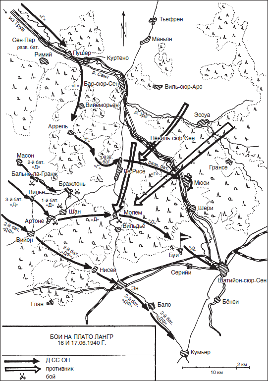 17.06.1940 года. Во время наступательного марша авангардом захвачено большое число пленных. До сих пор нам не встречалось сильное сопротивление противника. Около 10:00 1-й батальон «ДФ» вошел в Нисе. 1-й батальон должен наступать отсюда в направлении Гризеля, чтобы уничтожить силы врага, которые движутся ему навстречу. Начавшаяся атака остановлена, так как вражеские войска сдались.