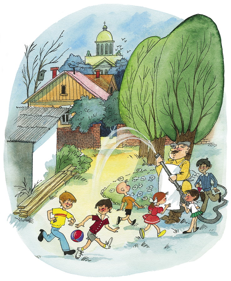 Время от времени снизу поднималась серебряная струя воды. Можно было подумать, что посреди двора лежит большой кит. Детский Доктор, конечно, понимал, что этого не может быть. Он знал, что это дворник дядя Антон поливает клумбу.