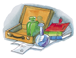 – Минуточку, минуточку, чтобы не забыть... Это «Порошок смеха» для грустной девочки Томы. Очень сильнодействующее средство... Уж если он не поможет... Так... Бутылка антиболтина. Так, так. Перед употреблением взбалтывать... Это для одного болтуна... А для вашего Пети...