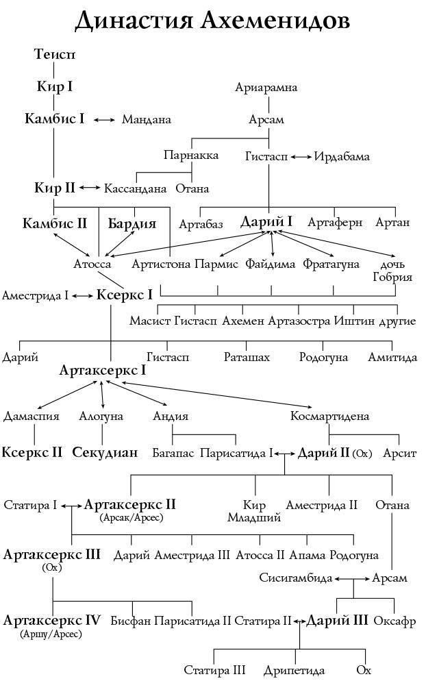 Фарнасп и Кассандана были членами почтенного древнеперсидского клана, известного как Ахемениды, представители которого, вероятно, поселились в окрестностях Персеполя еще в 900 г. до н. э. У них были славные предки. Основатель их династии Ахемен был овеян легендами. По слухам, в детстве его взрастил орел на вершине одной из гор Загроса – очевидно, это местная вариация мидийского сказания о Зале и волшебной птице. То, что Киру удалось заручиться поддержкой Ахеменидов и даже жениться на дочери этого древнего дома, стало крупным успехом в его борьбе против Астиага. В детях Кира текла кровь Теиспидов и Ахеменидов, что дало им завидную персидскую родословную. Связь Кира с Ахеменидами еще более укрепилась, когда Аршама, виднейший ахеменидский предводитель, вместе со своим молодым и энергичным сыном Гистаспом также присягнули на верность Киру и Теиспидам Аншана. Таким образом, Кир заручился верностью всех Ахеменидов.