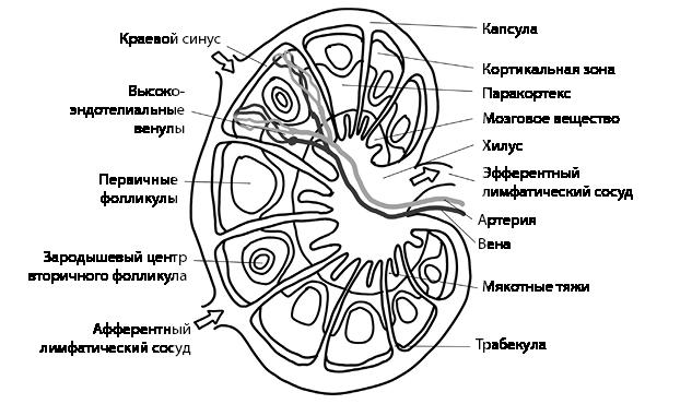 Итак, лимфатическая сеть – это тайные дороги лейкоцитов, по которым они и двигаются после боя к месту отдыха, если у них вообще бывает отдых. Но чаще всего они направляются к отделению полиции – лимфатическому узлу, где отчитываются о выполненной работе и получают новое назначение. Ведь лимфоциты живут 80–120 суток. Все это время они выполняют поручения, но обычно какое-то одно. Переучивать лимфоциты слишком накладно. Организму проще и выгоднее взять свежеиспеченную клетку и обучить ее, чем гнать по новой в университет – в вилочковую железу (тимус) – и в лимфоузел отправлять старый лимфоцит на переподготовку.
